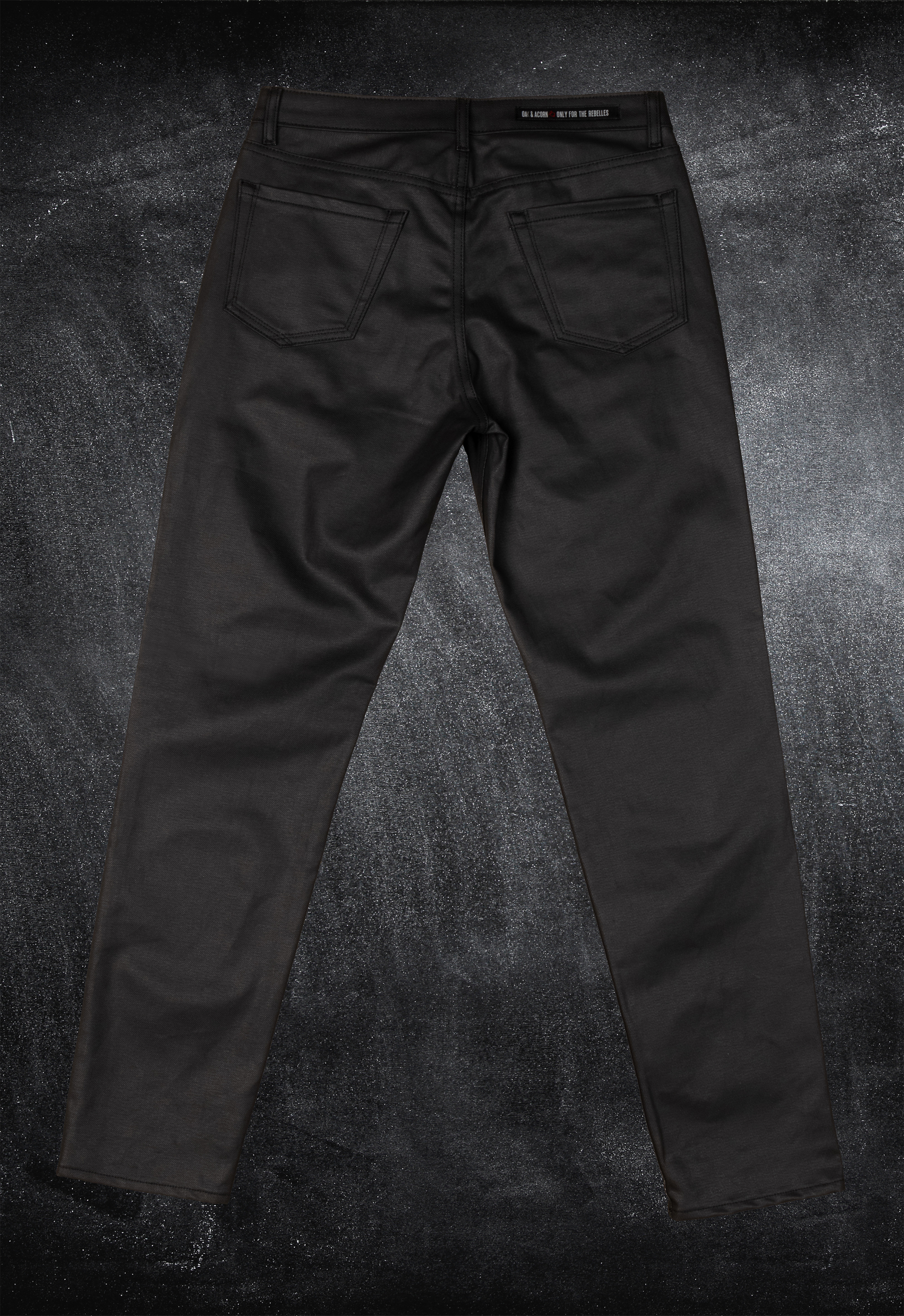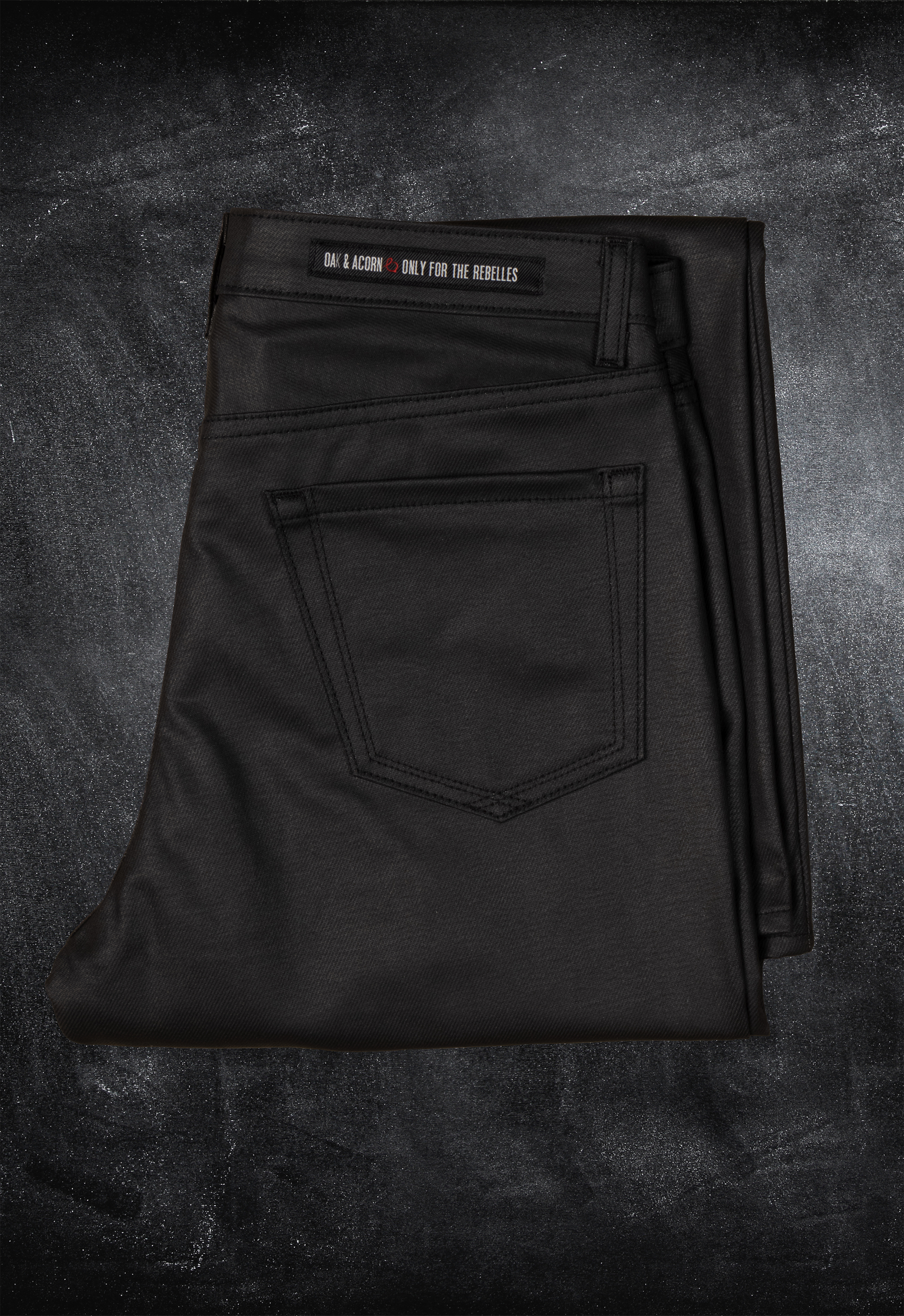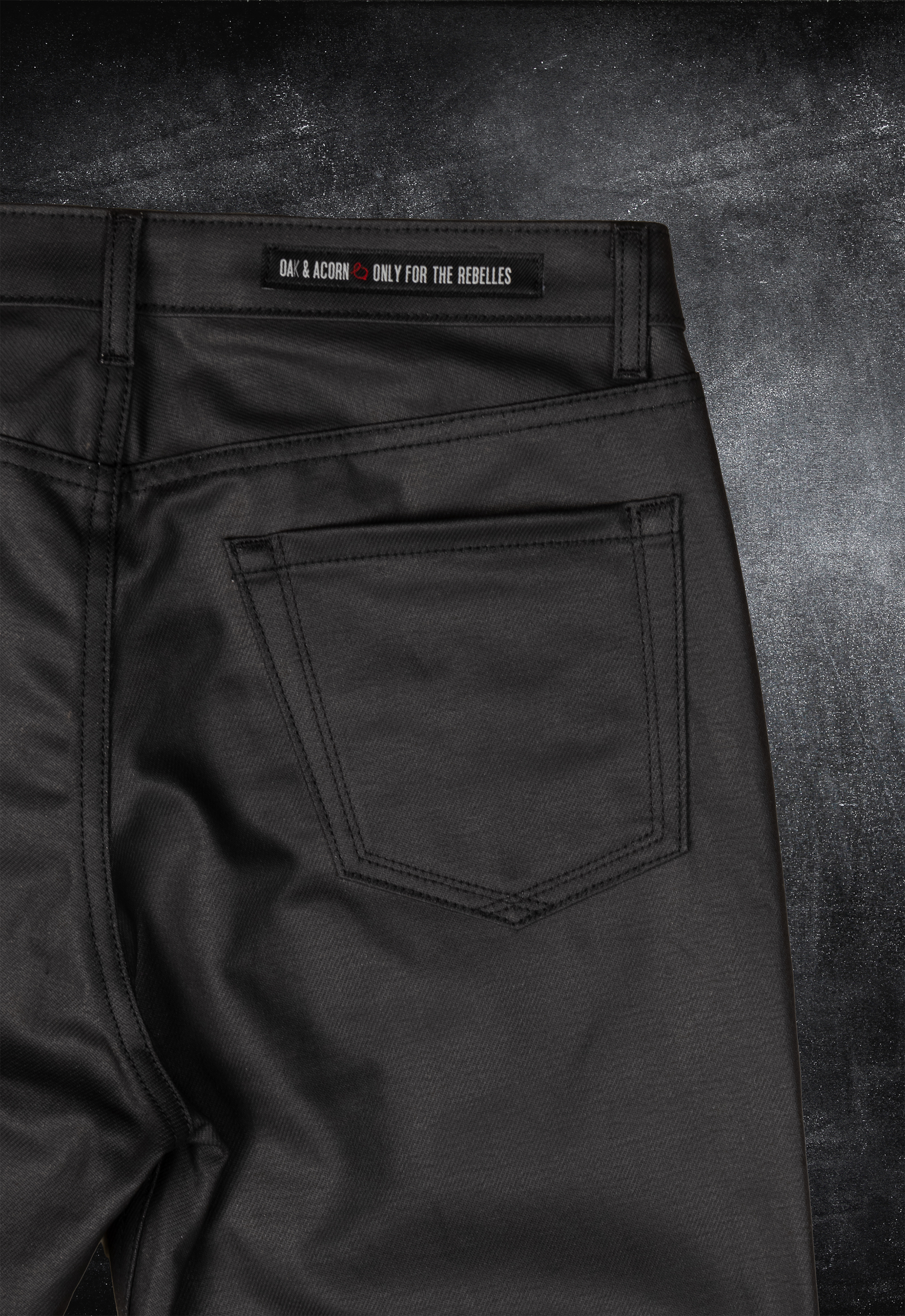 This specialty denim has a coating applied via rotary printing, which gives the fabric a shiny, glossy, leather-like appearance while enhancing flexibility and handfeel.