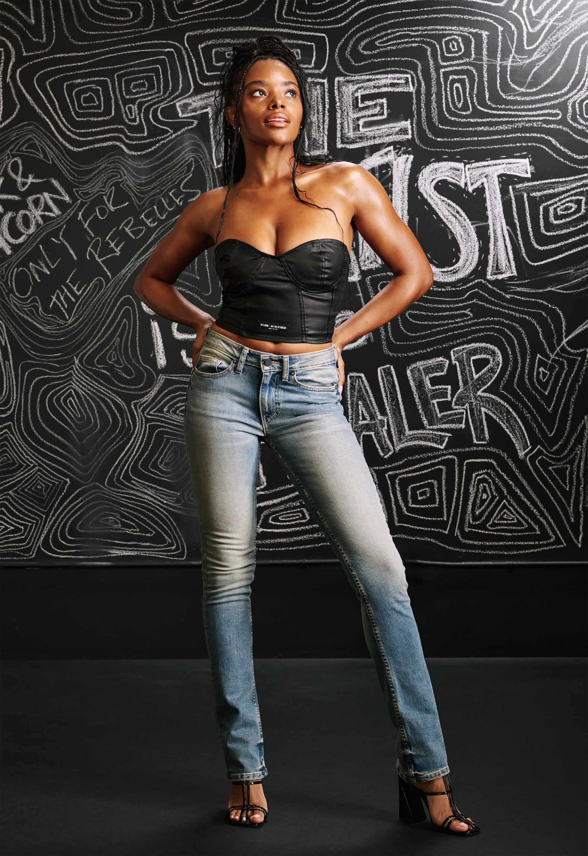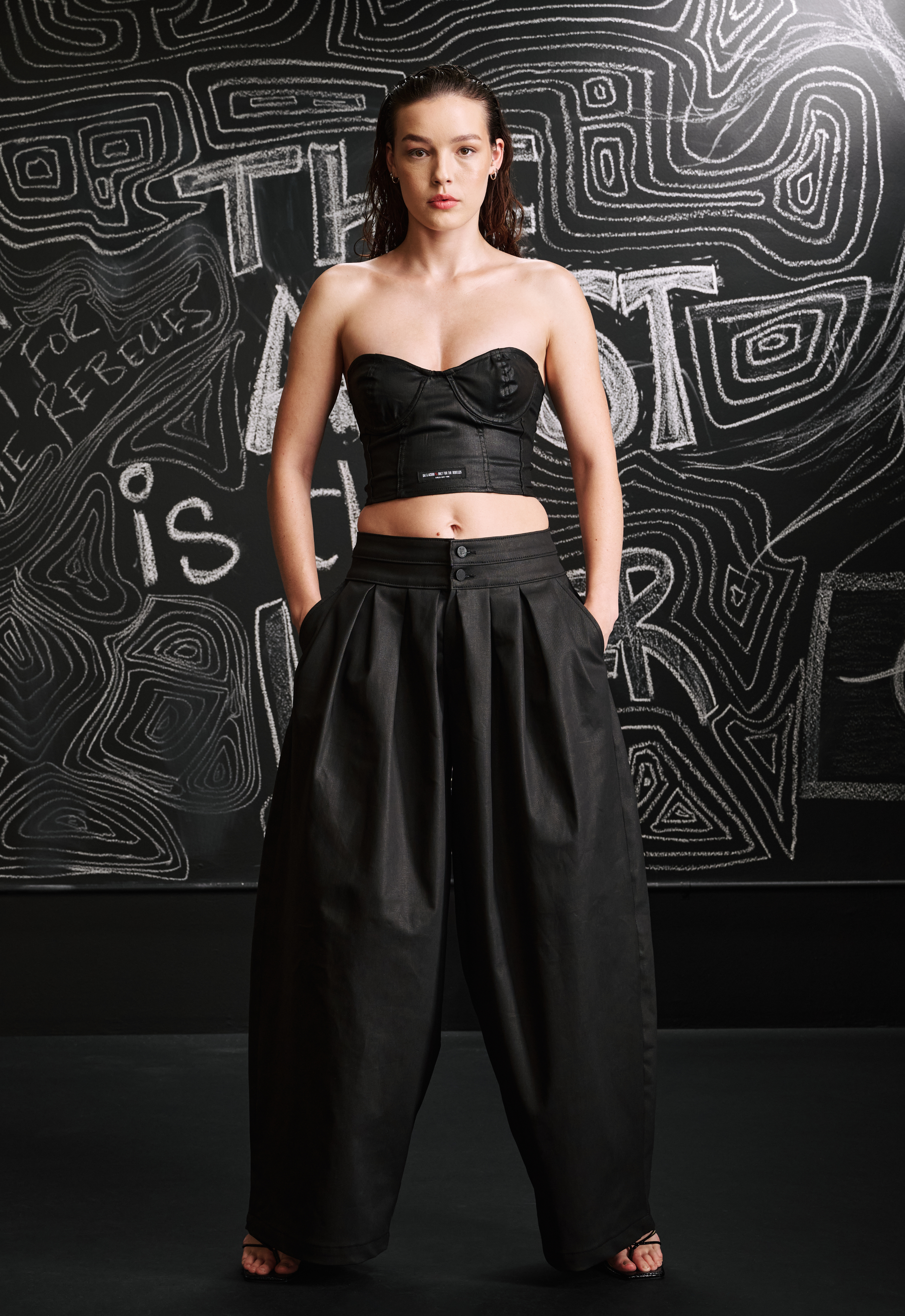 The Santi is a form-fitting bustier made from coated stretch denim that gives a leather look.