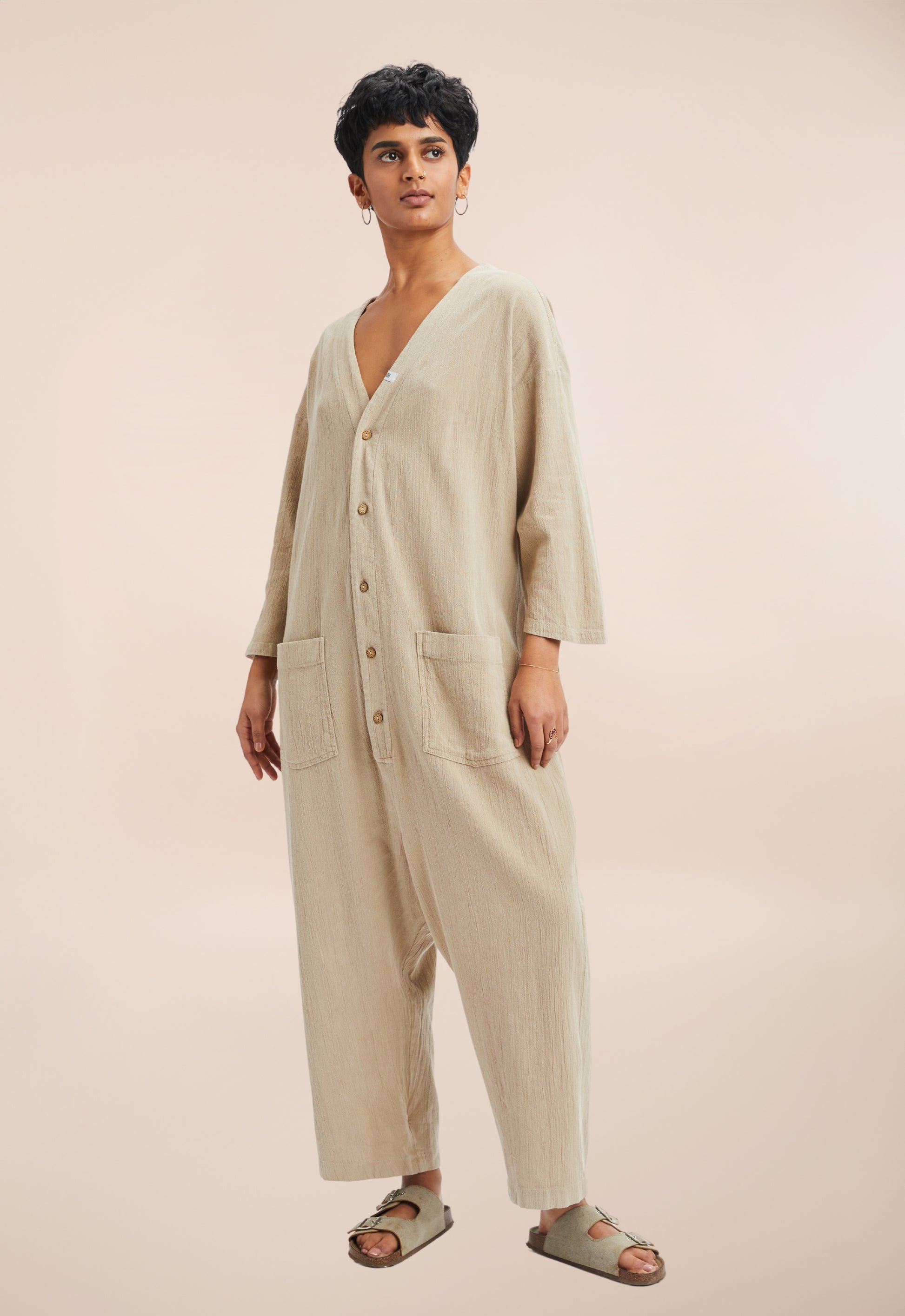 The Sower Jumpsuit is a loose fitting & naturally comfortable coverall. Light and breathable, the Sower is adorned with natural wooden buttons, has a drop-crotch, front & back patch pockets and a cropped hem. The plant-dyed handwoven fabric is super soft & wears better with age. Perfect for lounging and meditation.