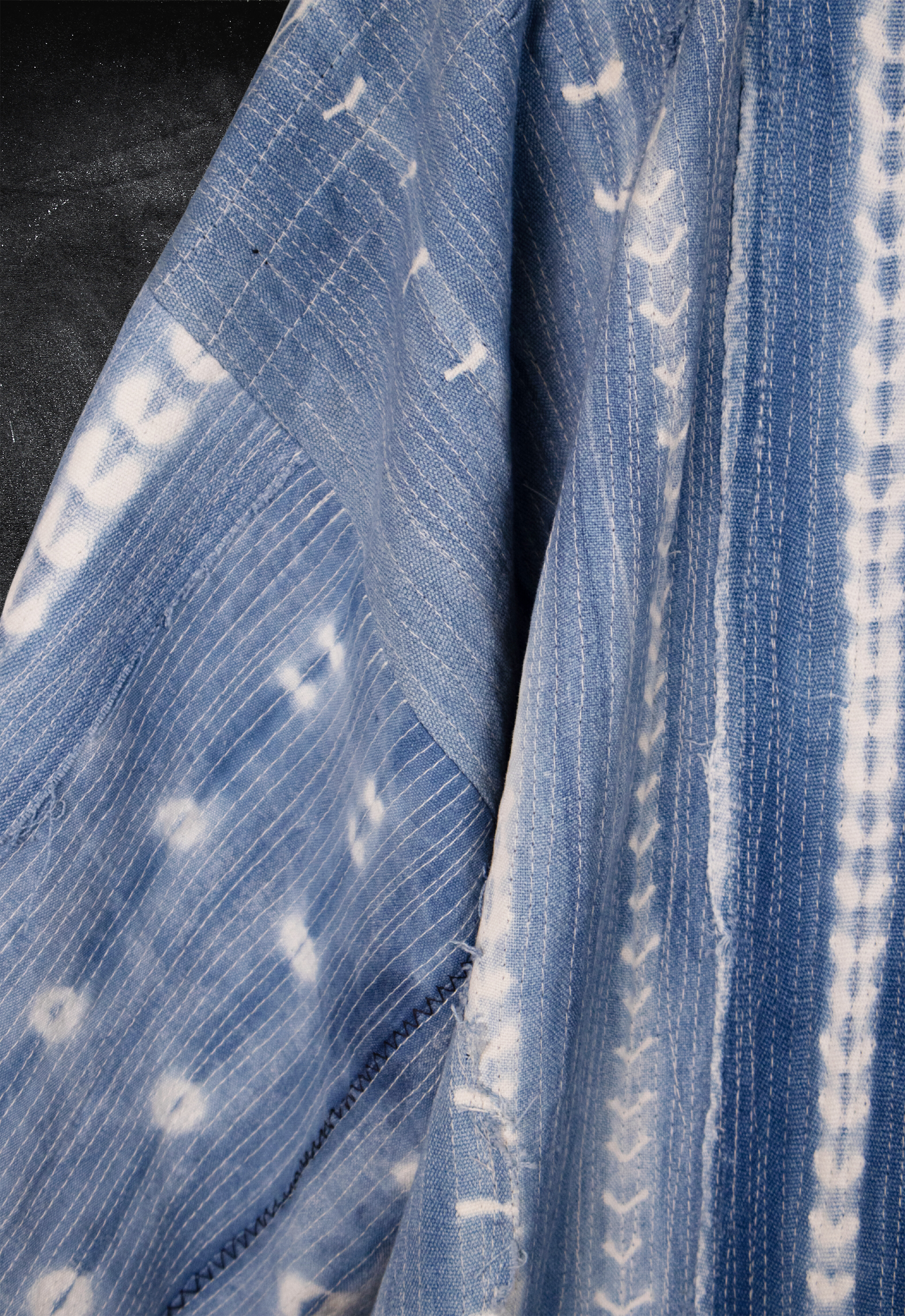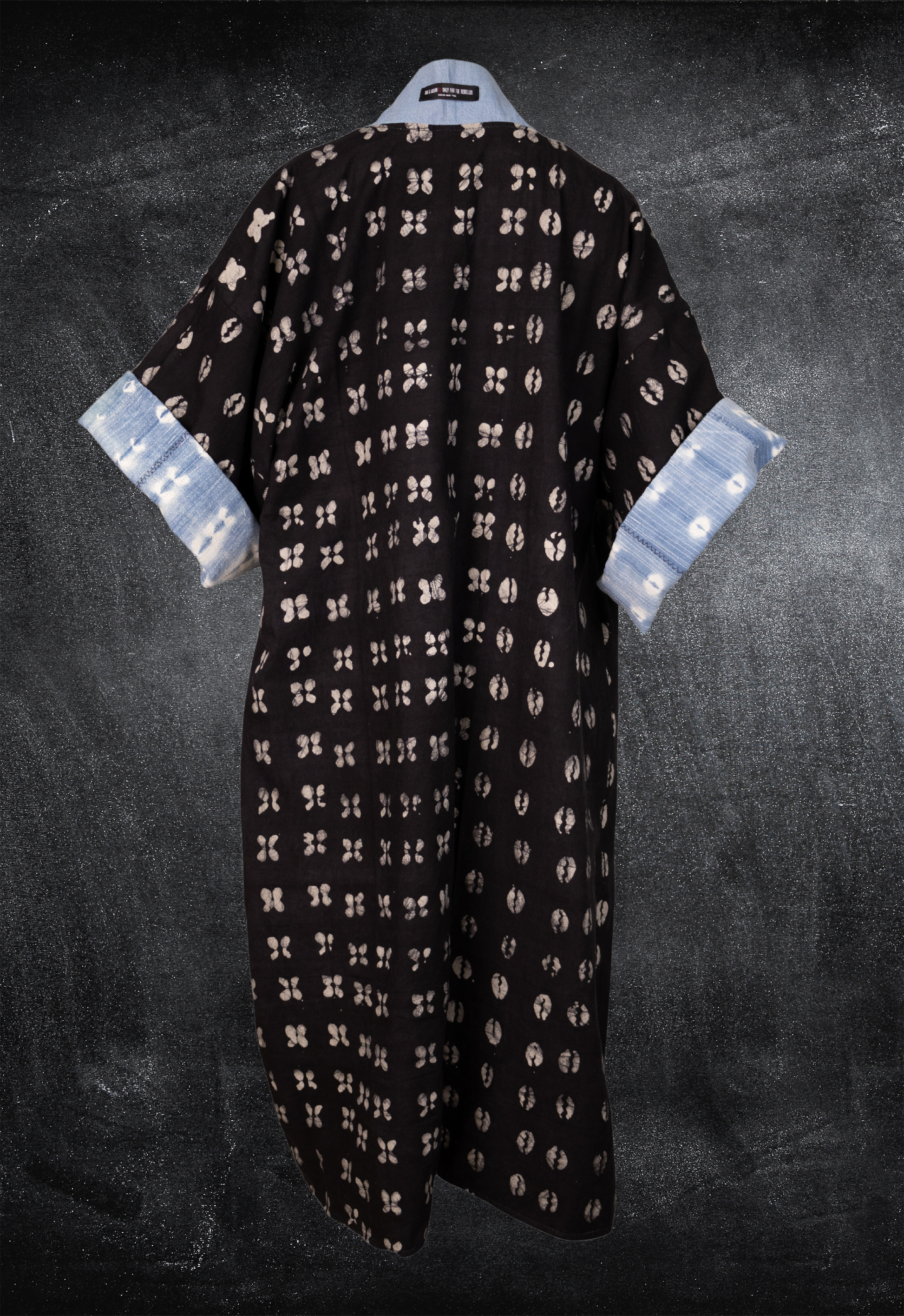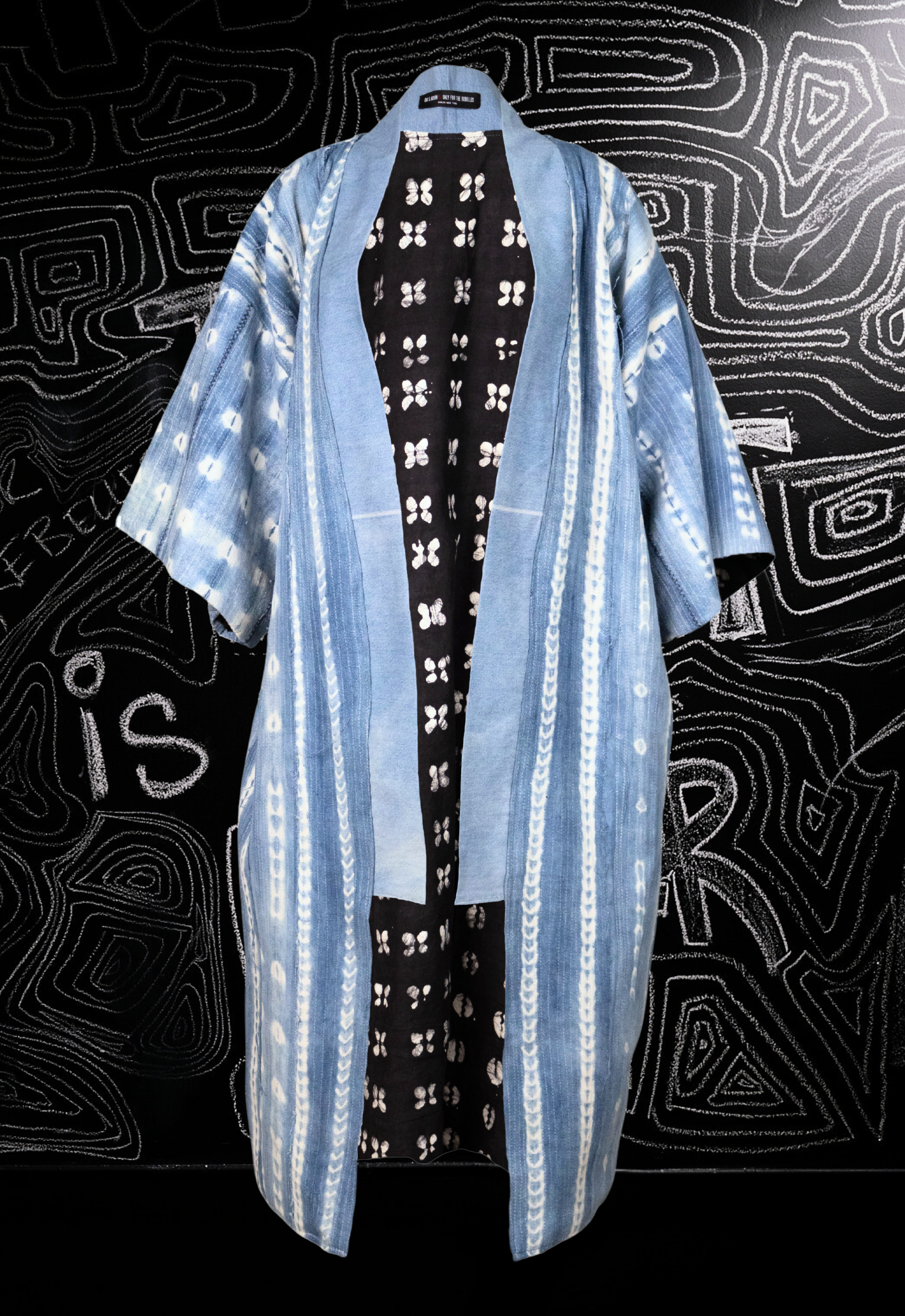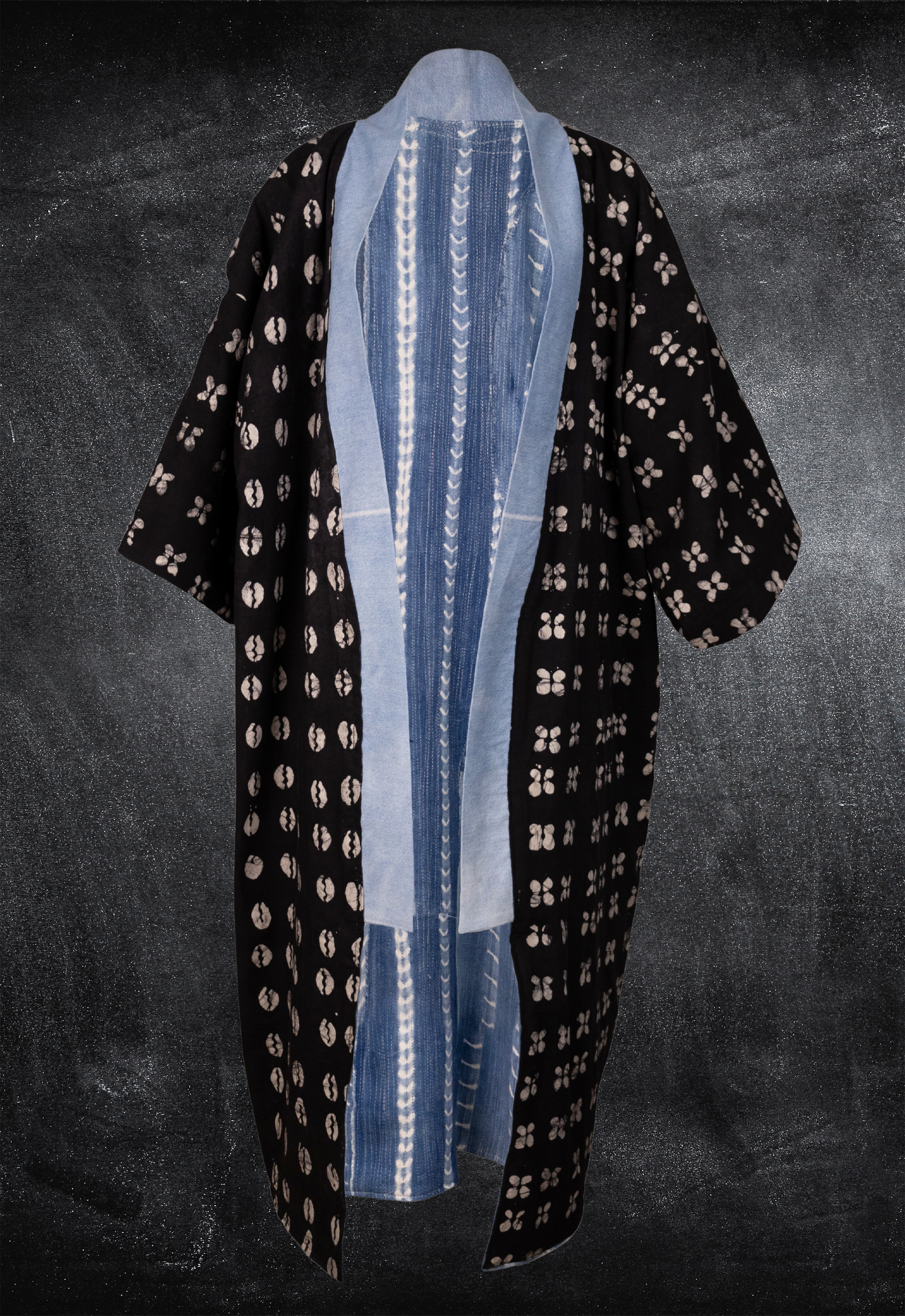 The Rooted Kimono is made of reclaimed vintage West African indigo fabric scraps, hand-printed indigo blankets & repurposed denim. Hand cut indigo scraps are carefully sewn & quilted to make a rich outer shell. Reversible, our hand-dyed indigo block print - Black Sun - is revealed on the inside. The Rooted Kimono is truly a piece of art.
